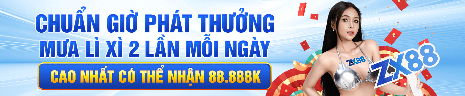 Đến với nhà cái ZX88N Com người chơi không cần phải suy nghĩ nhiều về những ưu đãi tiền thưởng, khuyến mãi độc quyền 2 lần mỗi ngày giá trị 88,8888K vào lúc 14 giờ và 1,888,888,888K và lúc 20 giờ mỗi ngày